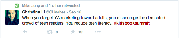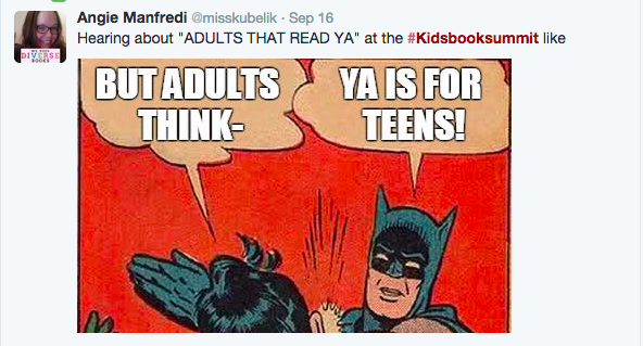 Earlier this month, Nielsen’s #KidsBookSummit caused quite an uproar on Twitter. Among other faux pas, the summit included a panel of adult YA readers who claimed they wanted to see less dystopian, more realism, and a possible name change to the genre (YAH, or young-at-heart, was suggested). Obviously I wasn’t there, I just read the play-by-play through Twitter, but the whole thing seemed all sorts of off and awkward and tone-deaf for a lot of reasons I won’t get into. It also sparked a pretty virulent reaction, mostly from YA writers, and a discussion of who YA is for.